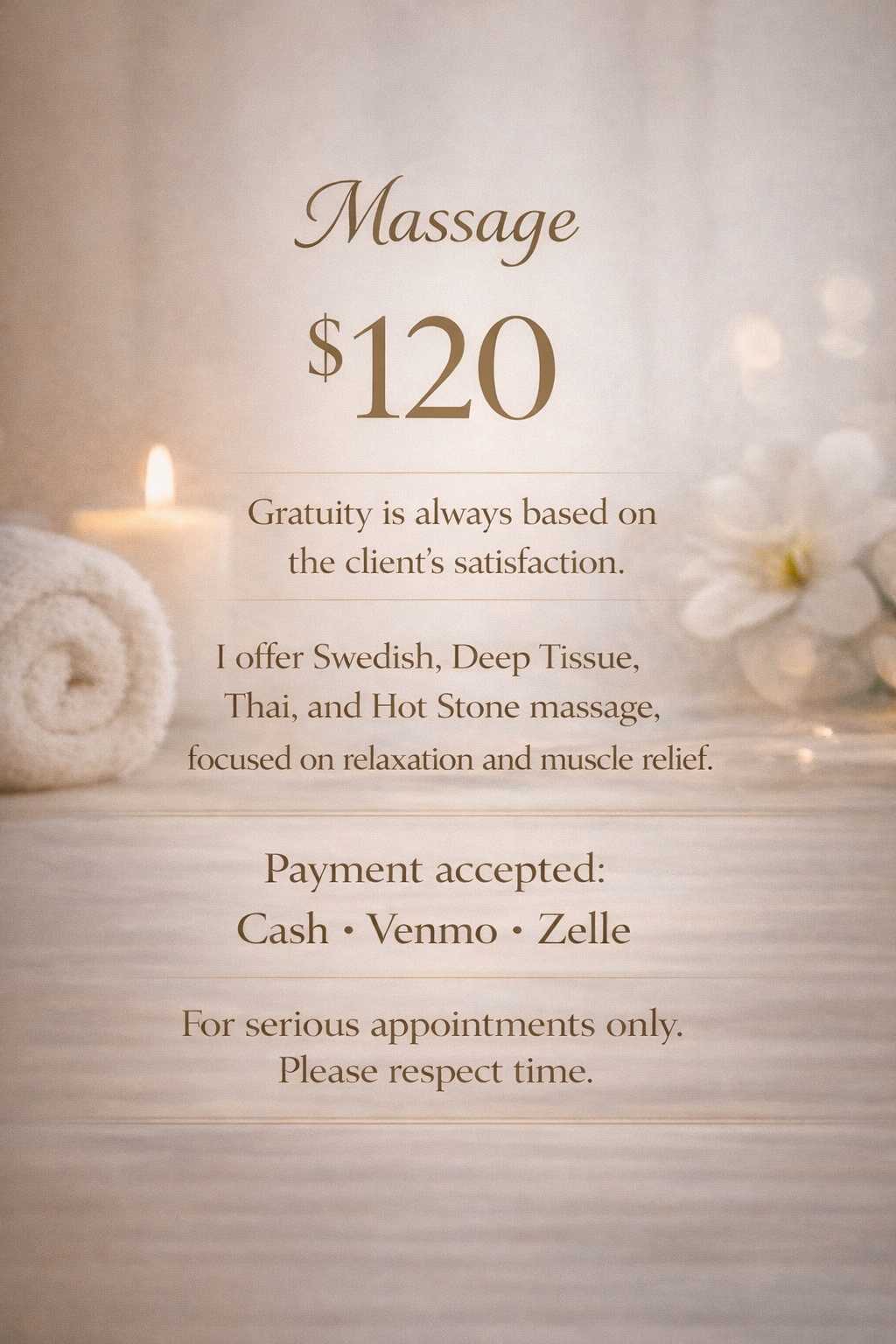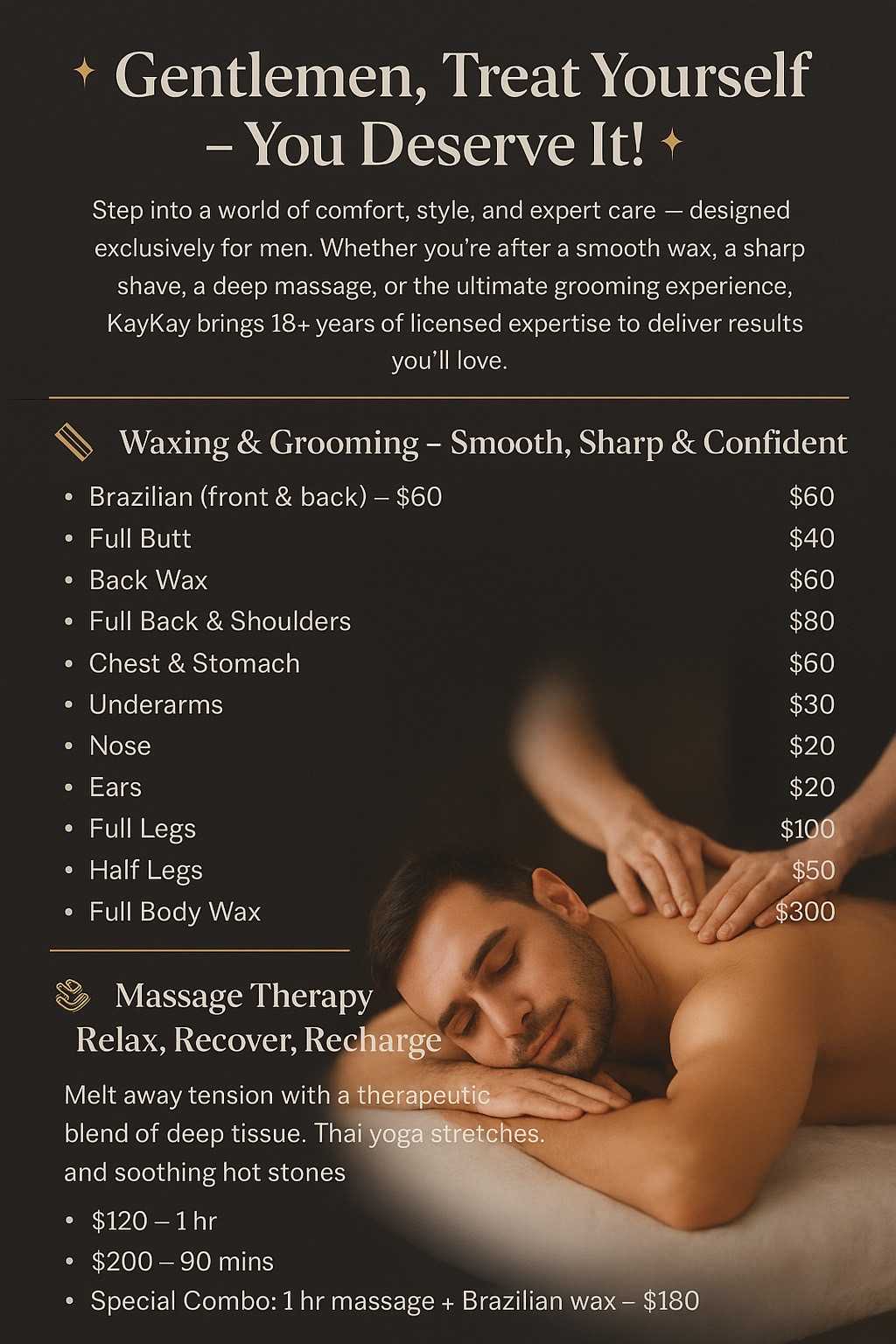 π Welcome the New Year with Deep Relaxation Recharge your body, calm your mind, and step into the New Year refreshed, relaxed, and renewed. βΈ» ππ»ββοΈ New Year Signature Packages β¨ $120 60-Minute Massage β’ Swedish / Deep Tissue / Thai Combination β’ Stress relief & muscle relaxation πβπ«ππͺ$180 60 Minute Massage & private area waxing,Trimming ,Shaving β¨ $200 60-Minute Massage + Body Scrub β’ Deep cleansing & full-body refresh β¨ $300 90-Minute Massage + Body Scrub β’ Total body reset & long-lasting relaxation π€ WHY KK PRIVATE STUDIO β’ Operated by one professional therapist only β’ One client at a time for maximum privacy β’ Clean, safe, and private studio β’ Secure and convenient parking available β’ Private shower room provided with full amenities: β Toothbrush & toothpaste β Mouthwash β Comb β Perfume β Shampoo & body wash β’ Professionally trained with extensive experience β’ Exceptional attention to hygiene, comfort, and detail π Conveniently located next to the metro station, within walking distance from Dunn Loring Metro Station. βΈ» π BOOKING POLICY πZelle,Venmo NEW CLIENTS REQUIRE A $50 DEPOSIT to confirm the appointment β’ Deposit is applied toward your service β’ No deposit = No booking β’ No-shows or late cancellations will forfeit the deposit Gentlemen only Private studio | By appointment only Serious clients only, please π Text to book: 703-901-3702 Confirmed deposit = confirmed appointment π« NO Fake Appointments π« NO Spam Numbers β Serious Customers Only β Please & Thank You π I donβt discuss personal details. Please feel free to ask about my services or professional experience. The photos shown are my real photos. I do not send additional photos, so please do not ask.