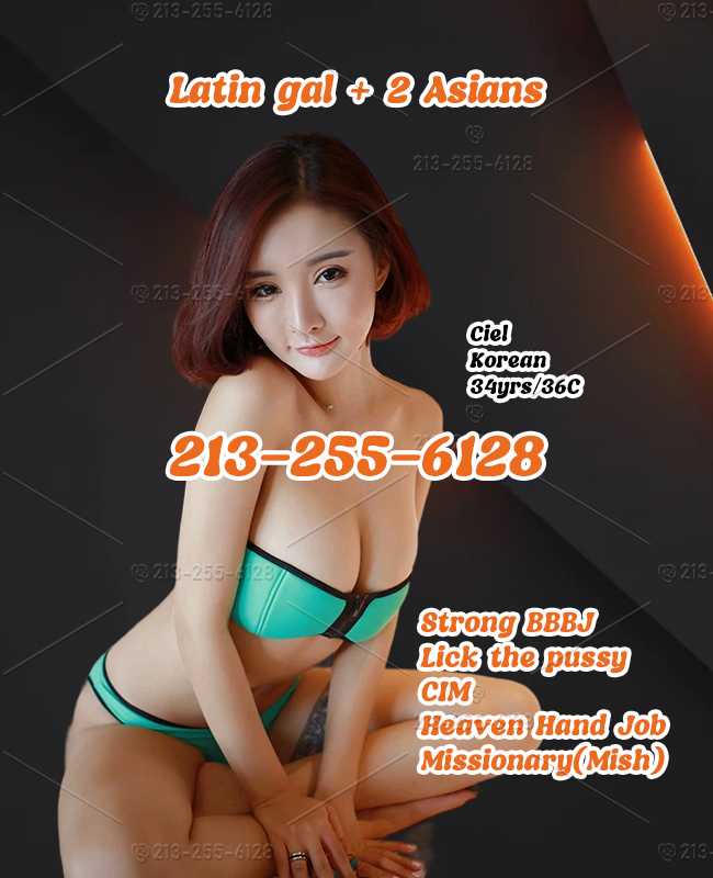 New gals coming in SFV! Ciel/Korean/34yrs/36C Kaelani/Taiwanese/22yrs/34C Mia/Latina/24yrs/34D Our advantages: EASY PARKING + No rush services! You can call us to book the services and get the parking methods! Available:9:00-0:00 Services details: -Strong BBBJ:When knees down,I love to suck your glans.Let your penis slide from my face to lips.Spit to your glans.Then suck it hard like hurricane.If you cum to my face,semen will flow from lips to my boobs. -Lick the pussy:Lift me up on the bed and eat my secret forest, I will squirming and making so much moan. -CIM:Put your hard "big brother" into my mouth,I gonna use my lips contain it,and move from your glans to the bottom,till your tasting cream(semen) rush to my mouth or face. -Heaven Hand Job:Softest hands in the world,have a good grip with hands and stroke your dick nicely up and down. -Missionary(Mish):I offer to spread my legs, use both hands pull up my separated legs and show you my hairless abalone pussy, waiting for hardcore thrusts. Menu information: $140 for 20mins $160 for 30 mins $200 for 30 mins $260 for 60mins $300 for 60 minutes VIP U may confused,why same time but different prices?That's the surprise we provide,if u come u will feel amazing. You will be regreted if not coming!Catch your time to come ASAP!213-255-6128